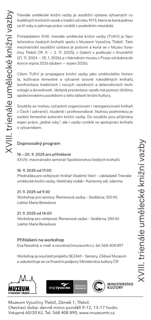 Pořadatelem XVIII. trienále umělecké knižní vazby (TUKV) je Společenstvo českých knihařů spolu s Muzeem Vysočiny Třebíč. Tato mezinárodní soutěžní výstava je putovní a koná se v Muzeu Vysočiny Třebíč (19. 9. — 2. 11. 2025), v Galerii v podloubí v Kroměříži (21. 11. 2025 — 25. 1. 2026) a v Národním muzeu v Praze od dubna do konce srpna 2026 (duben — srpen 2026).