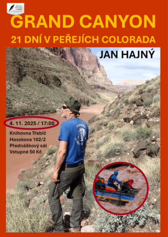 Městská knihovna a Jan Hajný zvou na prezentaci o raftingu na řece Colorado.