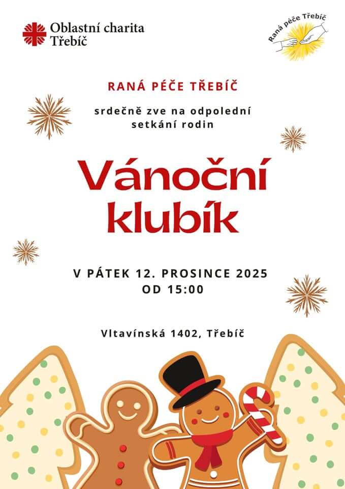 rádi bychom vás srdečně pozvali na poslední letošní odpolední setkání rodin, které se uskuteční v pátek 12. prosince 2025 od 15:00 v prostorách rané péče na adrese Vltavínská 1402 v Třebíči.