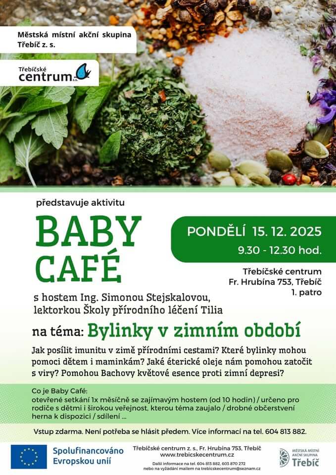 V pondělí 15.12..2025 zveme na další Baby Café. Hostem bude lektorka Školy přírodního léčení Tilia Ing. Simona Stejskalová a povídat si budeme o Bylinkách v zimním období. Jak posílit imunitu v zimě přírodními cestami? Jaké éterické oleje nám pomohou zatočit s viry? Pomohou Bachovy květové esence proti zimní depresi? To se dozvíme