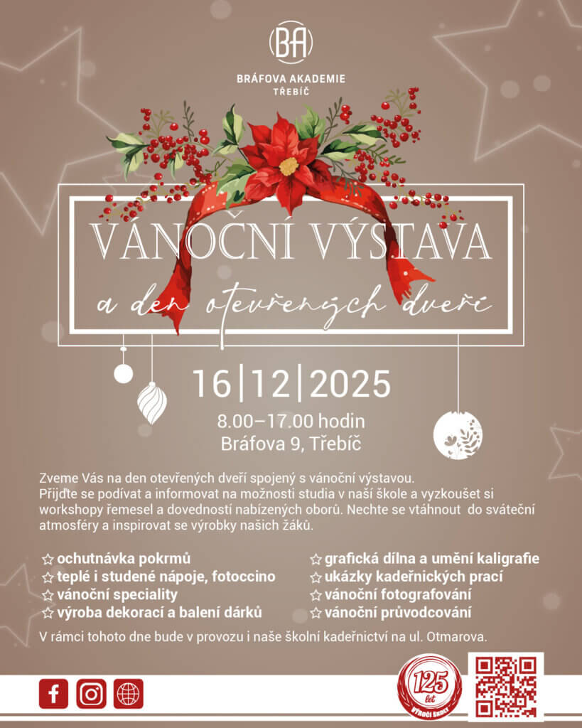 Přijďte si užít sváteční atmosféru, ochutnat dobroty, vyzkoušet si kreativní dílny a inspirovat se výrobky našich žáků. 16. 12. 2025 8:00–17:00
