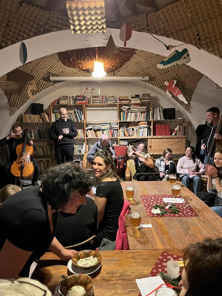 Každoroční hraní vánočních koled ve vyzdobené hospůdce Trumpetka při praskání dřeva v krbu.