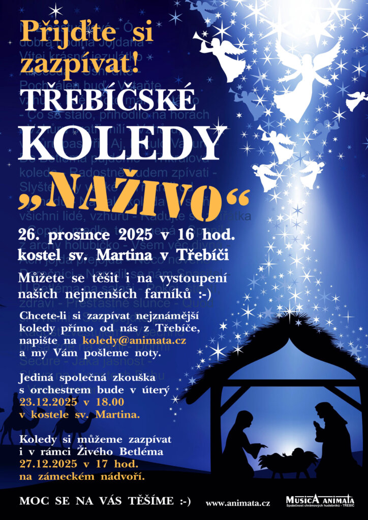 Tyto koledy si můžeme zazpívat nejen 26. prosince 2025 v 16 hod. (zkouška ve 14:45) v kostele sv. Martina v Třebíči, ale i v rámci Živého betlému 27. prosince 2025 v 17 hod. (zkouška v 15:30) na zámeckém nádvoří u baziliky sv. Prokopa.