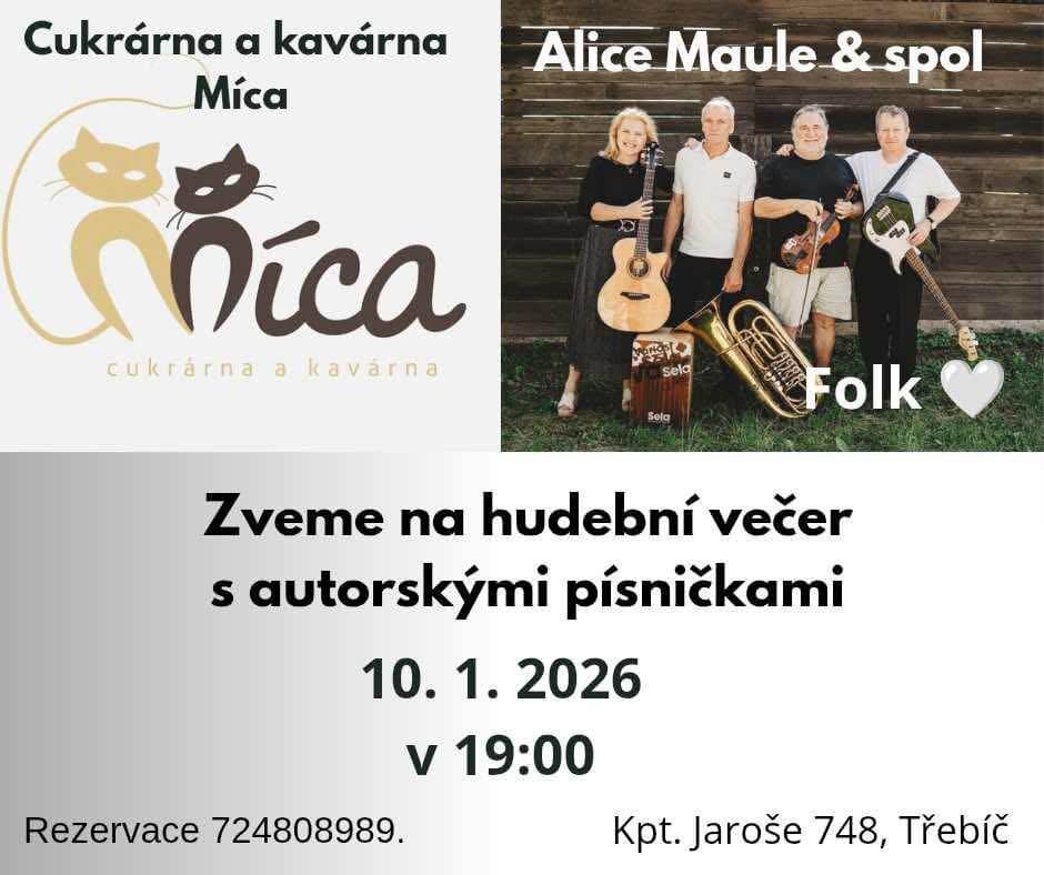 Srdečně Vás zveme na folkový hudební večer. Čeká na Vás naše čtyřčlenná kapela Alice Maule & spol, která pro Vás bude hrát autorské písně s Alice šuplíku k poslechu a třeba i k tanci ( když se vám bude chtít). Dále čekejte bohaté občerstvením a útulné prostředí Cukrárny Míca v Třebíči.