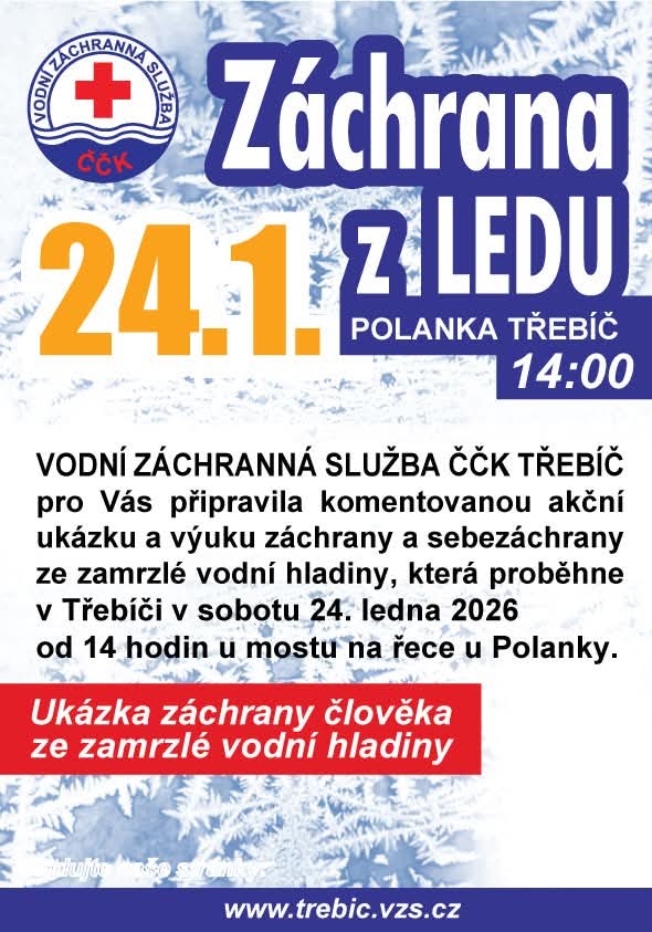 Zveme Vás v sobotu 24.1.2026 na ukázku s výukou záchrany a sebezáchrany z ledu, která proběhne v Třebíči u Polanky na řece u mostu od 14:00.