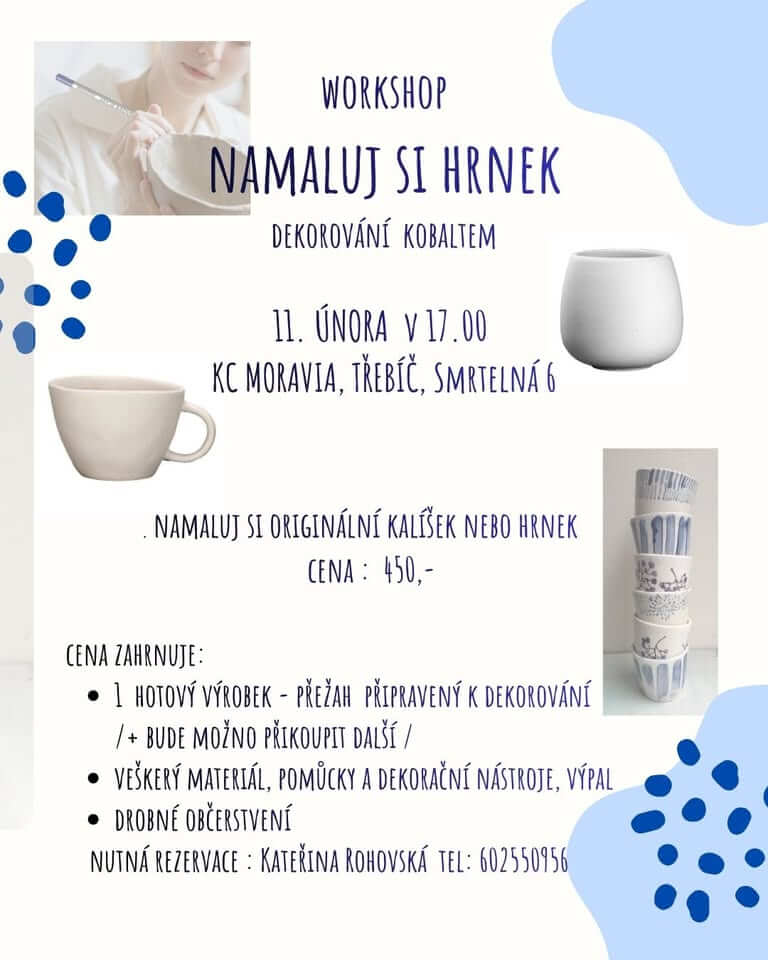 Vezměte kamarádku, kolegyni, mámu, dceru nebo partnera a přijďte si užít fajn podvečer. Tentokrát budeme dekorovat již připravené polotovary klasickou hrnčířskou technikou – malování kobaltem. Použijeme navíc i podglazurní pastelky a engoby.