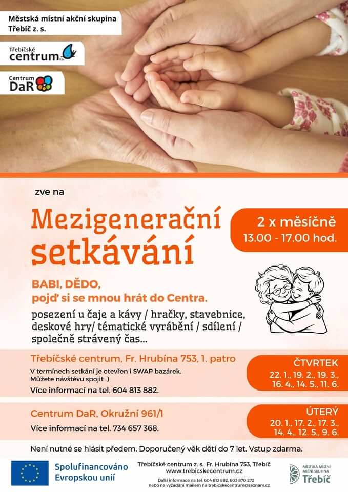 Zveme na mezigenerační setkávání do herny Třebíčského centra (1. patro). Vezměte s sebou, babičku, dědečka, tetu, strejdu… koho chcete a přijďte si pohrát, popovídat a něco si vyrobit. Je možné přijít kdykoliv v čase mezi 13 a 17 hodinou. Vstup je zdarma, není potřeba účast předem hlásit. Těšíme se Vás ![]()