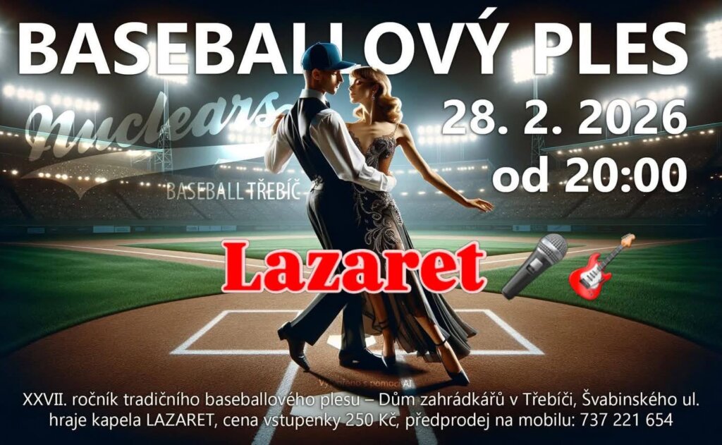 🗓 Datum: Sobota 28. 2. 2026 🕗 Čas: Od 20:00 📍 Místo: Dům zahrádkářů, Třebíč, Švabinského ul. 🎵 Hudba: Kapela LAZARET 🎟