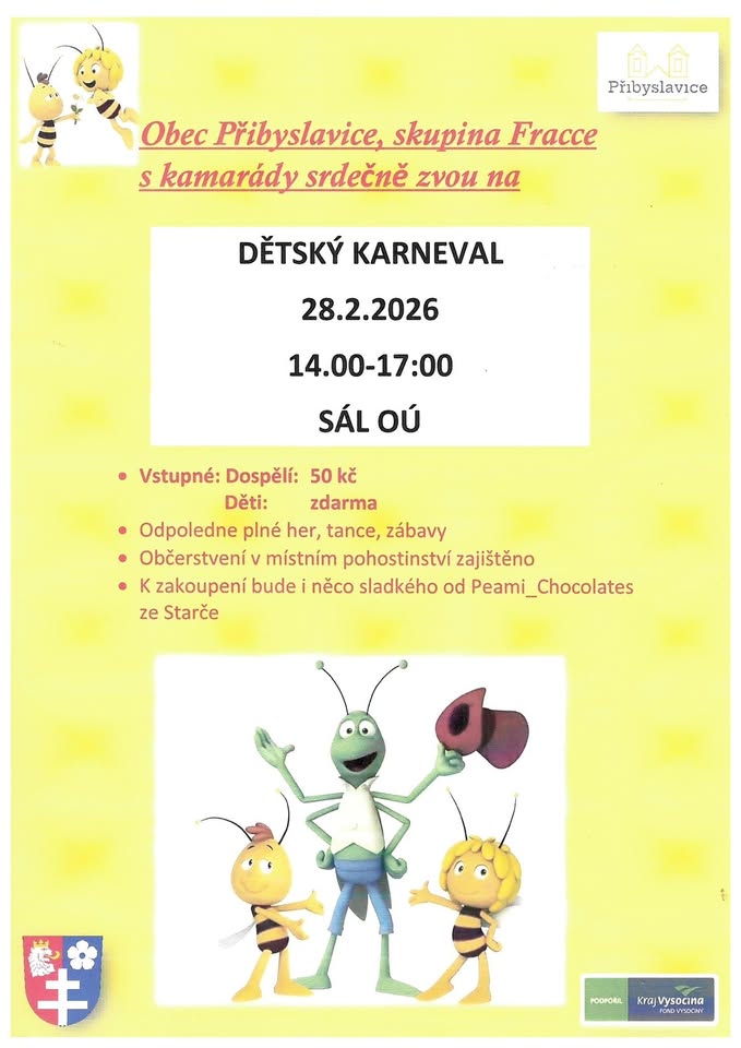 Srdečně vás zveme na dětský karneval, který se uskuteční 28. února 2026 od 14:00 do 17:00 v sále obecního úřadu v Přibyslavicích.