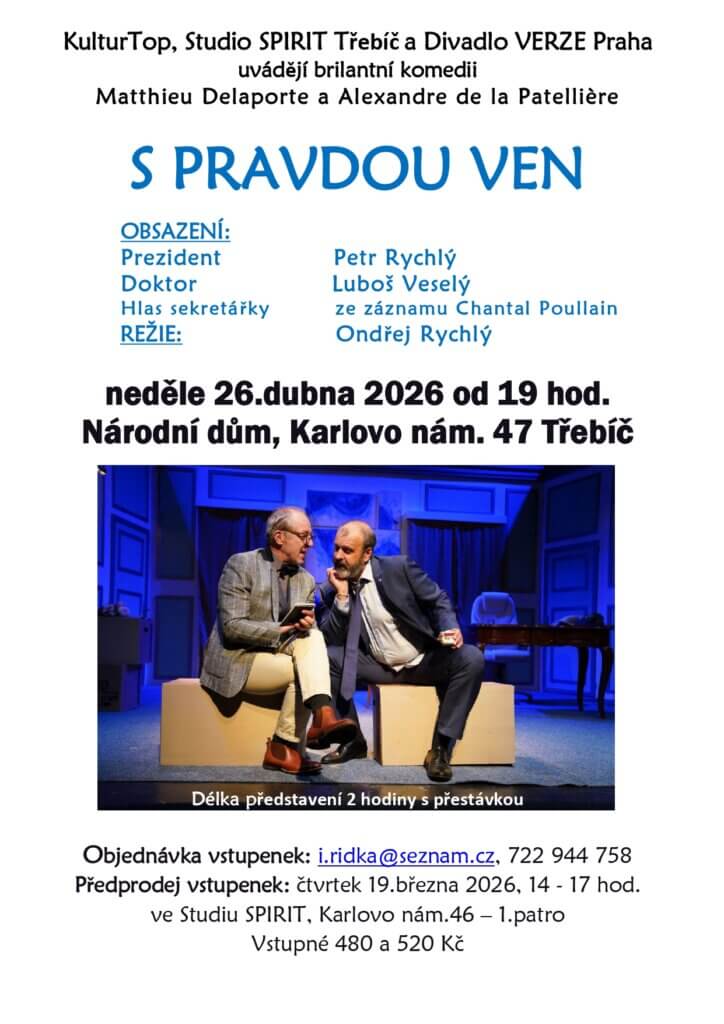 Předprodej vstupenek: čtvrtek 19. března od 14 do 17 hod. ve Studiu SPIRIT, Karlovo nám.46 v Třebíči.