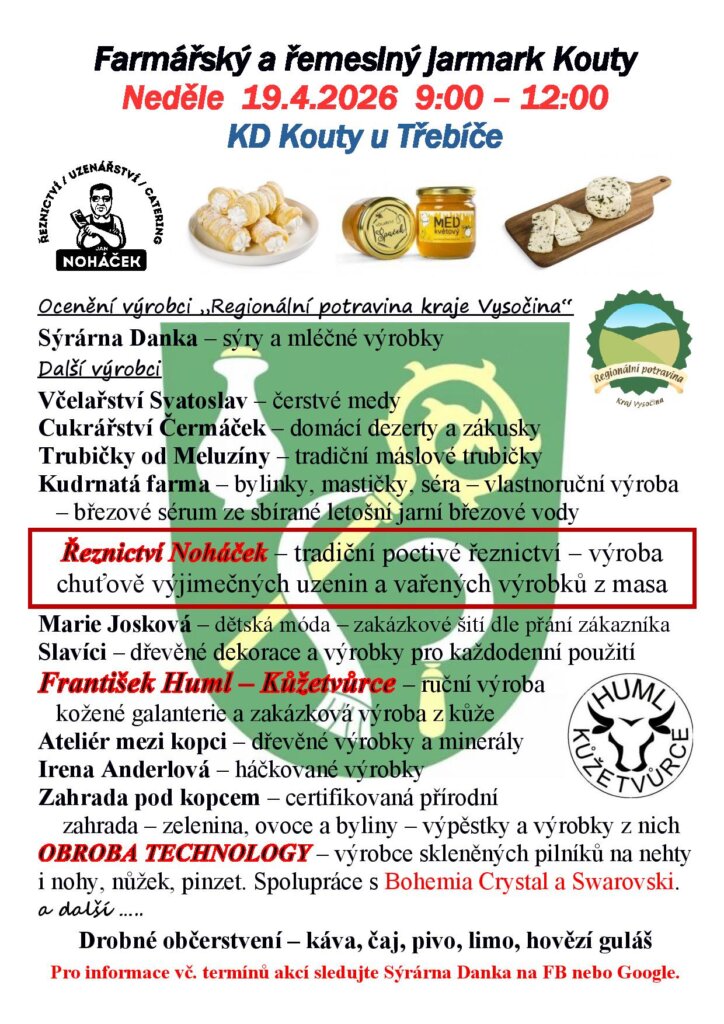 Zveme Vás na nákup toho nejlepšího z výběru výrobců z našeho regionu (drobné občerstvení také bude – souse-vide hovězí guláš, točené pivko, chlebíčky, káva i něco sladkého…) – v kulturním domě v Koutech u Třebíče 😉